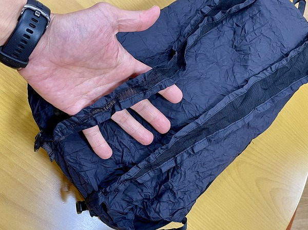 開いたときの容量は15リットル。小さめビジネスバッグとおなじくらいの容量です。