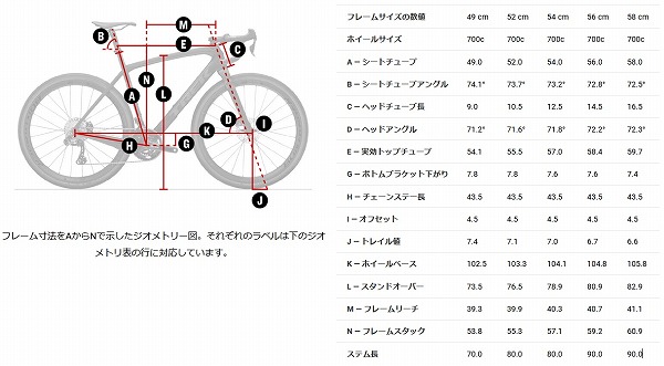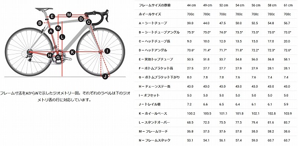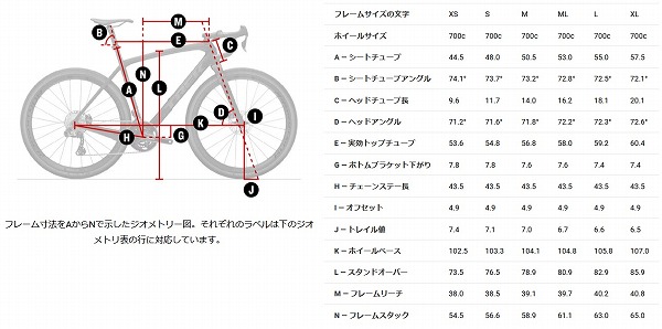 寸法表を見てみましょう。前作と比べると、走りに影響する設計数値に大きな変化はありません。強いて言えば、ヘッドチューブ長(=どのくらいハンドルを高く出来るか/低く出来るか)が長くなったことでしょうか?