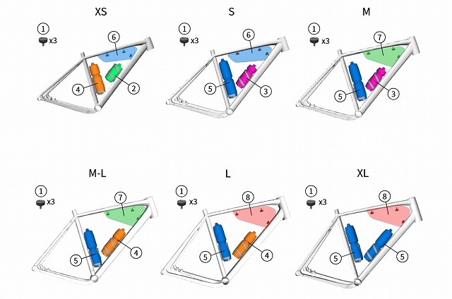 ダウンチューブには、まるでミサイル発射管のようにボトルケージ台座がたくさん。